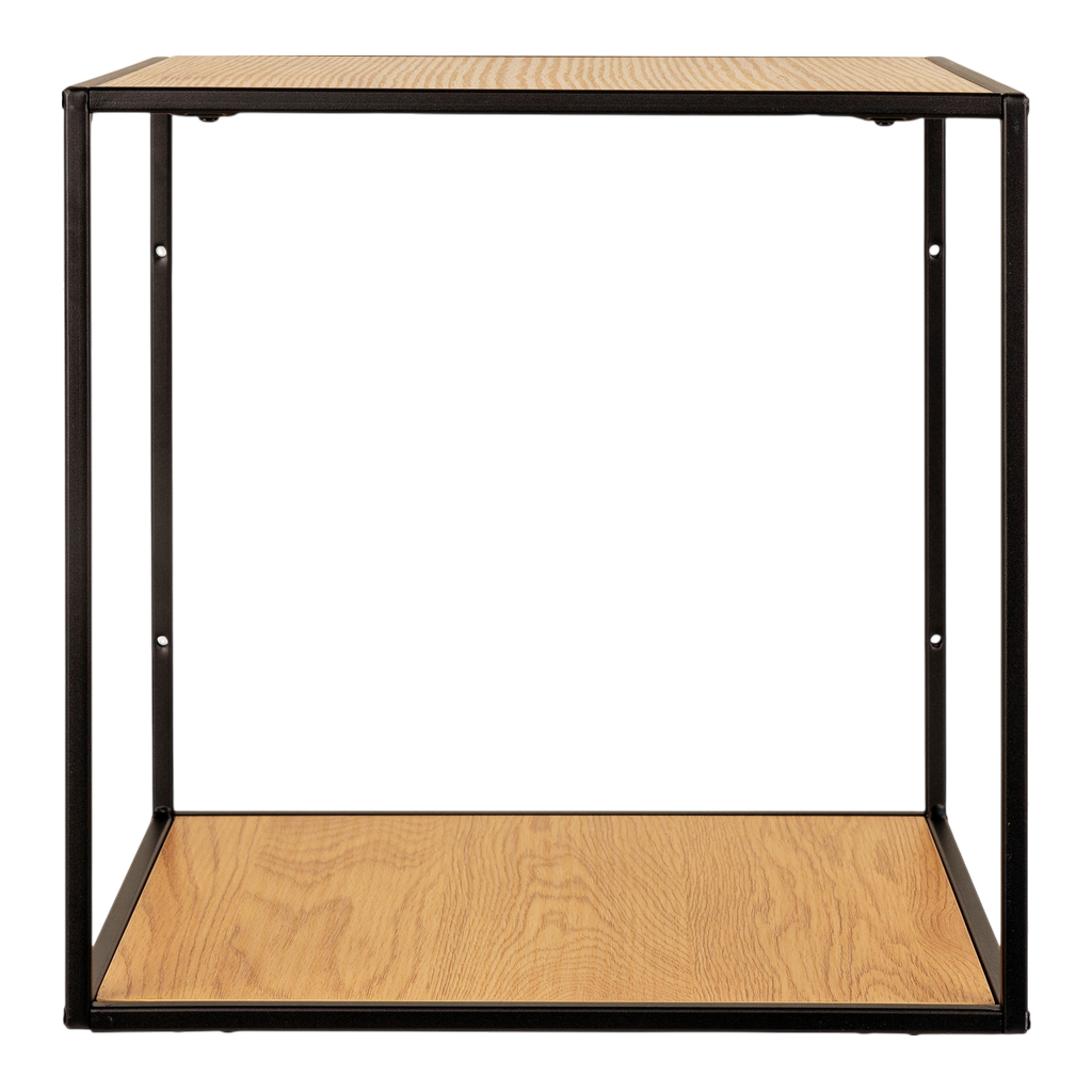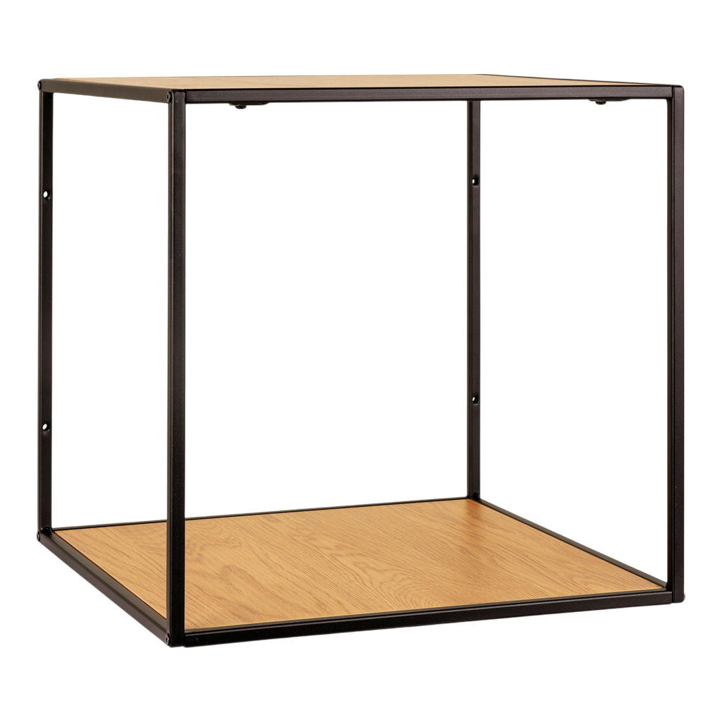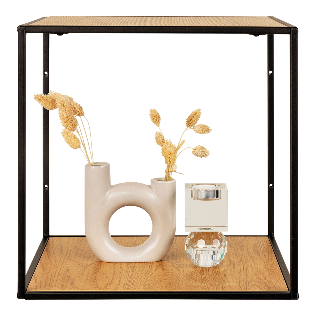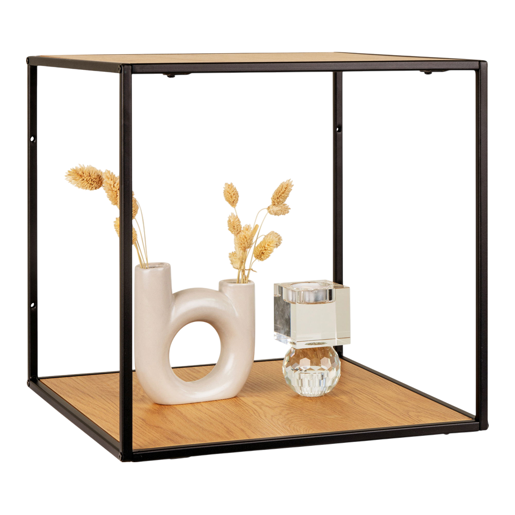 Cette étagère murale Vita allie élégance et fonctionnalité avec son cadre noir sobre et ses tablettes au look chêne naturel. Compacte (36x36x36 cm), elle s’intègre facilement dans tout espace, offrant un rangement pratique tout en apportant une touche chaleureuse à votre intérieur. Idéale pour organiser vos objets tout en valorisant votre décoration.